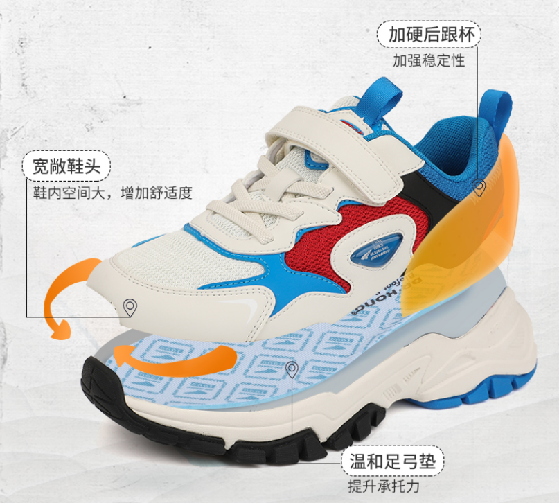采用“三维护足”概念设计,配有A、B、C三种不同足弓承托幅度及后跟斜度的鞋垫,穿上时能承托足弓及让后跟保持垂直;加硬后跟杯,稳定后跟骨,控制后足外翻的幅度;前足舒适围度,适合不同肥瘦的脚形,增加舒适度,也能更好保护小朋友运动中的足部。