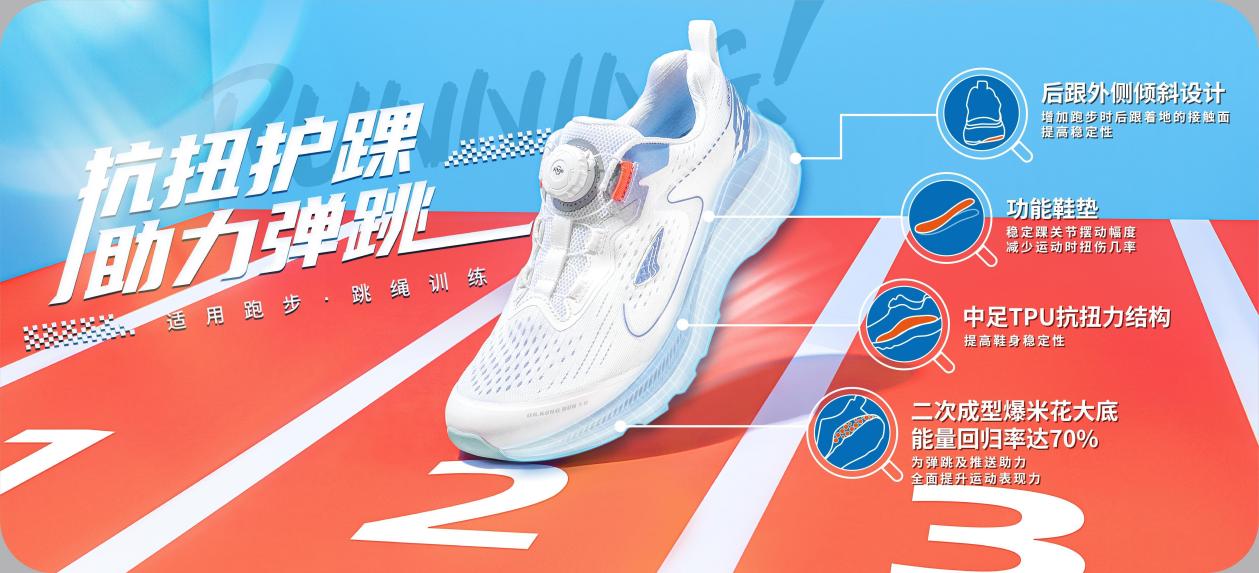 江博士健康鞋“少儿综训鞋”系列,特别为少儿日常跳绳、跑步等运动训练而设计。其二次成型爆米花大底,具有吸震及前掌迅速回弹作用,更轻、更稳、更弹,为弹跳及推送助力。更有中足TPU抗扭力结构及后跟杯加硬设计、后跟外侧倾斜设计、功能鞋垫等核心功能组合,能稳定踝关节摆动幅度,减少运动时扭伤几率,增强运动保护力,让孩子的日常运动也能享受到专业保护。
